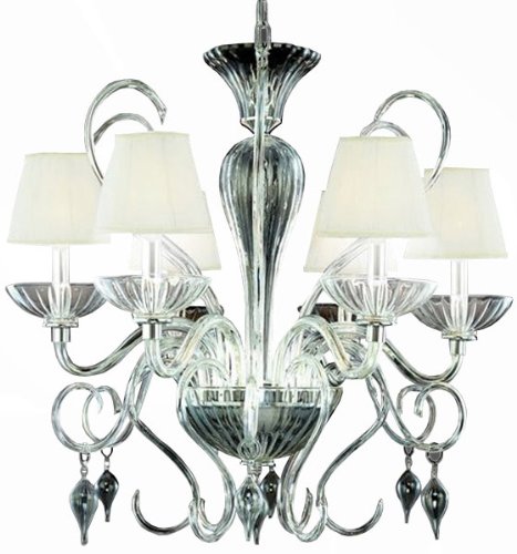 6 Light CHANDELIER,BLACK-Lucid crystalline framework is embellished with ethereally soft ivory shades. The clarity of this stunningly curved chandelier is touched with crystal droplets in signature designer style.,Uses 6 candelabra base bulbs, 60-Watts maximum (sold separately) ETL listed for safety,Bulb Base: Candelabra Bulb Type: Incandescent Chain Cord Length: 72 Collection: Celesto Country of Origin: CN Diameter: 29-3 4 Finish: Chrome Height: 29-3 4 Kit: No Number of Lights: 6 Shade Finish: Clear Style: Contemporary Modern Type: Non Crystal Chandeliers Voltage: 120-Wattage: 60