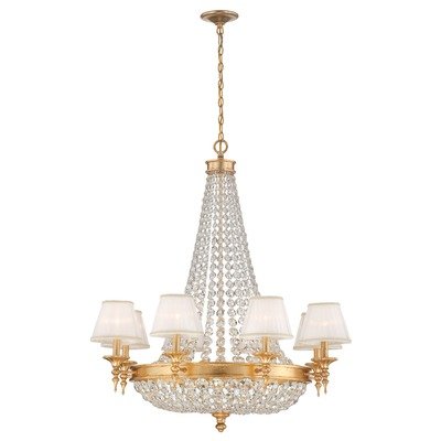 12Light CHANDELIER, GOLD-Antique gold leaf finish, white silk shades with lace braided piping.