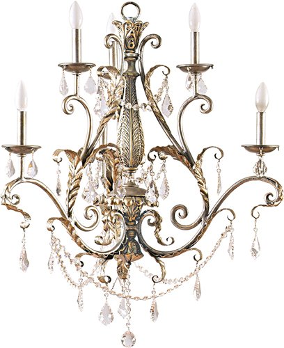 SWJ433 Features: -Six light chandelier.-Frame has a nice silvery shine.-Intricately detailed leaves.-With numerous faceted egyptian crystals.-Handmade.-UL rated. Includes: -Includes heavy duty designer chain and unique decorative canopy. Color/Finish: -Caribbean gold finish. Specifications: -Accommodates (6) 60W candelabra base bulb (not included). Assembly Instructions: -Assembly required. Dimensions: -Overall dimensions: 30'' H x 32'' W x 32'' D. Collection: -Swag collection. Warranty: -Manufacturer provides 1 year warranty.