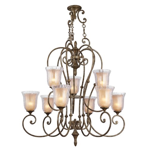 Light Bulb:(9)100w A19 Med F Incand Unique double-glass shades perch atop a romantically simple frame of this Veroia Nine-Light Chandelier.These exquisite shades combine Umber-Etched Glass on the interior with clear crackled glass on the exterior to emit a warm rich glow. This warmth is carried on through the new Burnished Granite Finish, artistic links and softly rounded arm detailing to create a sophisticated, yet uncomplicated Olde World design. For additional chain, see accessories Also compatible with 23-30W CFL bulbs Note: Fixture must be supported independently of the outlex box unless the outlex box is UL listed for the weight to be supported. Consult a qualified electrician/installer. Required installation parts included.
