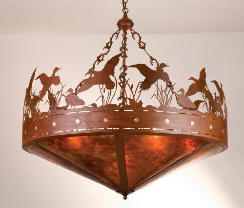 Meyda Tiffany 98952 Ducks in Flight 7-Light Pendant is hand crafted in the USA by Meyda artisans. A flock of ducks in and above cattails and marsh grasses top this wildlife inspired original pendant suspended from hand crafted branch-like chain links the bullet accented band and ducks top rich Amber mica panels and complemented by a rich Rust finish. The 98952 is 51.5-Inch high x 48-Inch wide, maximum hanging height is 84-Inch. The 98952 comes one per package, requires seven 100-Watt medium base incandescent bulbs (not included), dimmable using a standard incandescent dimmer. As in any hand crafted glass, patterning and the overall look may vary, and may not look exactly like the image shown when received, and may all differ slightly if ordering in multiples. Custom crafted in Yorkville, NY - please allow 30 days for shipping. The Meyda Tiffany Company is the nation's leading manufacturer and designer of Tiffany lamps and decorative lighting. Although founded in 1974, the firm's roots actually date back to the early 1900s, supplying Louis Comfort Tiffany and Tiffany Studios with lighting products, and creating the original Coca-Cola stained glass lamps and chandeliers.Meyda Lighting offers thousands of in-stock stained glass lighting and decor designs, with more than 50,000 customizable lighting options. Its vast line includes: Coca-Cola stained glass lighting group; Old Forge Collection of Rustic and Lodge styled lighting and decor; Craftsman Signature Series of outdoor and indoor lighting (including new landscape lanterns) featuring Arts and Crafts designs; Stained Glass lighting featuring Victorian, Nouveau and a broad range of styles; Art Glass windows and Fireplace Screens; Tiffany gifts and home accents; and The Metro and Metro Fusion Lines of contemporary art glass and fused glass designs.