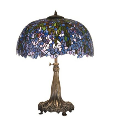 Meyda Tiffany 50009 Tiffany Laburnum Collection 3-Light Table Lamp features cascading blossoms in hues of Plum and Blue glass with Spring Green leaves which were favorite subjects of the L.C. Tiffany Studio. This beautiful Laburnum stained glass shade with undulating border is paired with a solid brass footed base in a warm antique patina finish. The 50009 is 23-Inch wide x 28.5-Inch tall. The 50009 comes one per package, and requires three 60-watt medium base incandescent bulbs (not included). As in any hand crafted glass, patterning and the overall look may vary, and may not look exactly like the image shown when received, and may all differ slightly if ordering in multiples. The Meyda Tiffany Company is the nation's leading manufacturer and designer of Tiffany lamps and decorative lighting. Although founded in 1974, the firm's roots actually date back to the early 1900s, supplying Louis Comfort Tiffany and Tiffany Studios with lighting products, and creating the original Coca-Cola stained glass lamps and chandeliers.Meyda Lighting offers thousands of in-stock stained glass lighting and decor designs, with more than 50,000 customizable lighting options. Its vast line includes: Coca-Cola stained glass lighting group; Old Forge Collection of Rustic and Lodge styled lighting and decor.