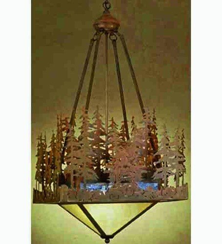 Meyda Tiffany 32211 Pine Lake 4-Light Inverted Pendant is hand crafted in the USA by Meyda artisans. Bring a little of the rustic outdoors into your personal sanctuary with the warm Rust finish complementing the Silver Mica panels with depictions of tall pine trees for a piece every lodge or cabin, or even an urban home deep in the city will appreciate for years to come. The 32211 is 41.5 inches high x 20 inches wide, maximum hanging height is 71.5 inches. The 32211 comes one per package, and requires four 100-watt medium base incandescent bulbs (not included), dimmable using a standard incandescent dimmer. As in any hand crafted glass, patterning and the overall look may vary, and may not look exactly like the image shown when received, and may all differ slightly if ordering in multiples. Custom crafted in Yorkville, NY - please allow 30 days before shipping. The Meyda Tiffany Company is the nation's leading manufacturer and designer of Tiffany lamps and decorative lighting. Although founded in 1974, the firm's roots actually date back to the early 1900s, supplying Louis Comfort Tiffany and Tiffany Studios with lighting products, and creating the original Coca-Cola stained glass lamps and chandeliers.Meyda Lighting offers thousands of in-stock stained glass lighting and decor designs, with more than 50,000 customizable lighting options. Its vast line includes: Coca-Cola stained glass lighting group. Old Forge Collection of Rustic and Lodge styled lighting and decor. Craftsman Signature Series of outdoor and indoor lighting (including new landscape lanterns) featuring Arts and Crafts designs. Stained Glass lighting featuring Victorian, Nouveau and a broad range of styles. Art Glass windows and Fireplace Screens. Tiffany gifts and home accents. and The Metro and Metro Fusion Lines of contemporary art glass and fused glass designs.