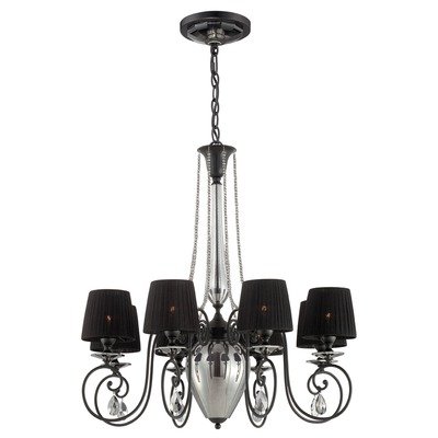 8Light CHANDELIER, BLACK-Blown and Chromed glass body, bobeches and accents, Black silk wound pleated shades.