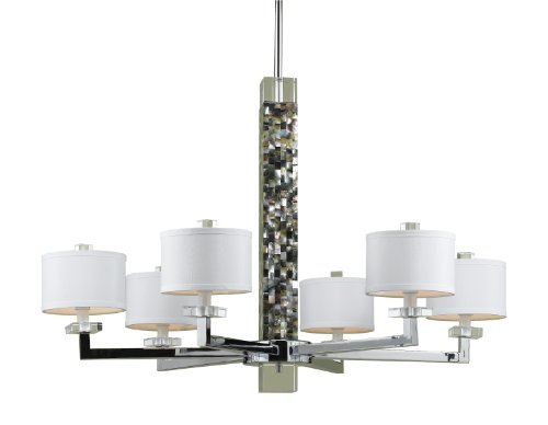7455-6H Features: -Six light chandelier.-Candice Olson Design.-White poly silk shade.-With abalone shell.-Hard wire.-3 adjustable poles: 6'', 12'' 18''. Construction: -Metal construction. Color/Finish: -Chrome finish. Specifications: -Accommodates (6) 40W candelabra base bulb. Dimensions: -Overall dimensions: 24.25'' H x 35'' D. Collection: -Sahara collection. Warranty: -Manufacturer provides 90 days limited warranty.