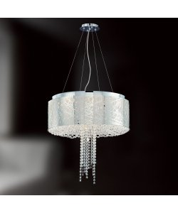Light Bulb:(12)20w T3 G4 12v Halogen Mela 12-Light Pendant/Flush Mount Laser cut polished chrome drum shade lined with a sparkling sheer of fabric gracefully perfected with a skirt of draped and cascading multi faceted crystal. Can be converted to flush mount fixture. Chrome finish White glass shade Clear crystal accents