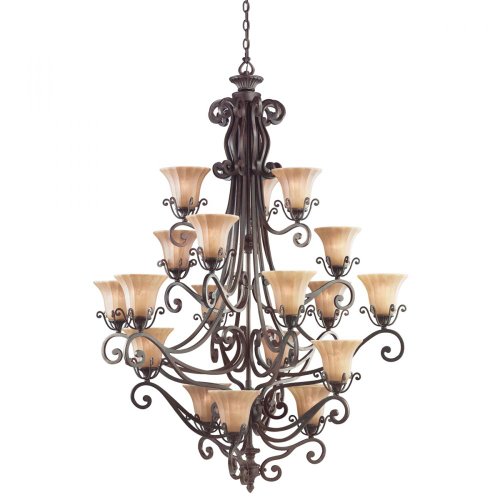 58 1/2"H x 44"W 18 - 60W Medium base bulbs (not included) Optional Crystal Pack 4964 sold separately. With a rich and historic look, the Cottage Grove Collection embodies elegant design and fine craftsmanship. Although quite decorative, the Cottage Grove Collection offers a more relaxed and informal feel. Our exclusive Carre Bronze finish with Mocha Wisp glass shades keep this family's antique ambiance, while remaining uniquely modern. To personalize these fixtures, Kichler offers Melon Swirl glass teardrop sets. They come by the dozen in 2" and 3" sizes and are the perfect accentuating touch to dress this family in crystal elegance. If you have a large, open room or area, this large 18 light, 5-tiered chandelier is an ideal selection. It uses 60-watt (max) bulbs, has a diameter of 40", and has a body height of 58 ".