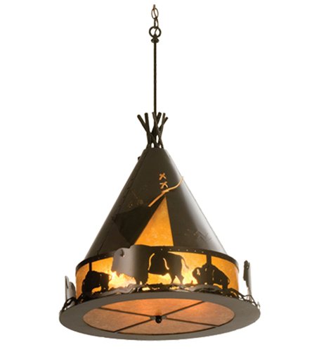 Meyda Tiffany 98741 Teepee with Buffalo 8-Light Pendant is handcrafted in the USA by Meyda artisans. A Native American teepee is surrounded by heard of Buffalo on this unique pendant. The fixture is finished in Antique Copper with Amber Mica panels. The 98741 is 36.5-Inch wide x 31.5-Inch high, with a maximum hanging height of 51.5-Inch. The 98741 comes one per package, and requires eight 100W medium base incandescent bulbs (not included). As in any hand crafted glass, patterning and the overall look may vary, and may not look exactly like the image shown when received, and may all differ slightly if ordering in multiples. Custom Crafted in Yorkville, New York. Please allow 30 days until shipping. The Meyda Tiffany Company is the nation's leading manufacturer and designer of Tiffany lamps and decorative lighting. Although founded in 1974, the firm's roots actually date back to the early 1900s, supplying Louis Comfort Tiffany and Tiffany Studios with lighting products, and creating the original Coca-Cola stained glass lamps and chandeliers.Meyda Lighting offers thousands of in-stock stained glass lighting and decor designs, with more than 50,000 customizable lighting options. Its vast line includes: Coca-Cola stained glass lighting group; Old Forge Collection of Rustic and Lodge styled lighting and decor.