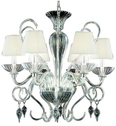 6 Light CHANDELIER, CLEAR-Lucid crystalline framework is embellished with ethereally soft ivory shades. The clarity of this stunningly curved chandelier is touched with crystal droplets in signature designer style.,Uses 6 candelabra base bulbs, 60-Watts maximum (sold separately) ETL listed for safety,Bulb Base: Candelabra Bulb Type: Incandescent Chain Cord Length: 72 Collection: Celesto Country of Origin: CN Diameter: 29-3 4 Finish: Chrome Height: 29-3 4 Kit: No Number of Lights: 6 Shade Finish: Clear Style: Contemporary Modern Type: Non Crystal Chandeliers Voltage: 120-Wattage: 60