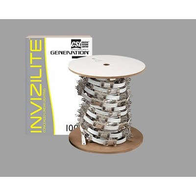 CSL Lighting INV100-6WT Invizilite Generation2 Pre-Assembled Kit features a 100-Feet roll of White super-flexible two-copper conductor cable with self healing PVC insulation rated at 90-Degree 12-Volt or 24V, 25 amp maximum 300W max. for 12V, or 600W max. for 24W. Cable is field cuttable anywhere along its length. 200 high grade clear polycarbonate construction stainless steel Sockets with aluminum heat shield are placed every 6-Inch, and will accept incandescent, xenon festoon lamps, or high-power one watt LED modules (sold separately). Socket and base snap together on the cable securing to the system without the use of a track. Socket can be easily removed by use of flat head screw driver and be re-installed if desired. INV100-6WT is 100-feet long by .61-Inch wide by .10-Inch thick, and includes pre-attached double-sided tape and mounting ear for secure installation. INV100-6WT comes one per package, includes five INVPW1 Power Feed 30 amp. terminal blocks, and five INVDE1 Dead Ends made of grade polycarbonate that snaps over end of cable with no tool. Low Voltage Transformer is required, and is sold separately. Invizilite Generation2 has been developed to answer all of the most challenging concealed lighting issues. Tight radii, sharp turns, confined coves and restrictive spaces are not a problem. A flexible two-conductor cable that allows maximum freedom for quick and easy installation and provides high load capacity for more light and fewer power feeds without requiring the use of a rigid track, making free-form designs a breeze. At CSL, we continue to lead the industry by offering amazing performance and design value in concealed linear lighting for Coves, Soffits and Under cabinet lighting. Our Invizilite, Mach 120, and Counter Attack series offers what may be the largest collection of halogen, xenon or fluorescent under-cabinet fixtures. Metal finishes including stainless steel, bronze and white are offered. Various cabling and switch options are available.
