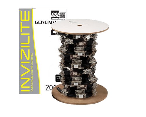 CSL Lighting INV200-3BK Invizilite Generation2 Pre-Assembled Kit features a 200-Feet roll of Black super-flexible two-copper conductor cable with self healing PVC insulation rated at 90-Degree 12-Volt or 24V, 25 amp maximum 300W max. for 12V, or 600W max. for 24W. Cable is field cuttable anywhere along its length. 800 high grade clear polycarbonate construction stainless steel Sockets with aluminum heat shield are placed every 3-Inch, and will accept incandescent, xenon festoon lamps, or high-power one watt LED modules (sold separately). Socket and base snap together on the cable securing to the system without the use of a track. Socket can be easily removed by use of flat head screw driver and be re-installed if desired. INV200-3BK is 200-feet long by .61-Inch wide by .10-Inch thick, and includes pre-attached double-sided tape and mounting ear for secure installation. INV200-3BK comes one per package, includes ten INVPW1 Power Feed 30 amp. terminal blocks, and ten INVDE1 Dead Ends made of grade polycarbonate that snaps over end of cable with no tool. Low Voltage Transformer is required, and is sold separately. Invizilite Generation2 has been developed to answer all of the most challenging concealed lighting issues. Tight radii, sharp turns, confined coves and restrictive spaces are not a problem. A flexible two-conductor cable that allows maximum freedom for quick and easy installation and provides high load capacity for more light and fewer power feeds without requiring the use of a rigid track, making free-form designs a breeze. At CSL, we continue to lead the industry by offering amazing performance and design value in concealed linear lighting for Coves, Soffits and Under cabinet lighting. Our Invizilite, Mach 120, and Counter Attack series offers what may be the largest collection of halogen, xenon or fluorescent under-cabinet fixtures. Metal finishes including stainless steel, bronze and white are offered. Various cabling and switch options are available.