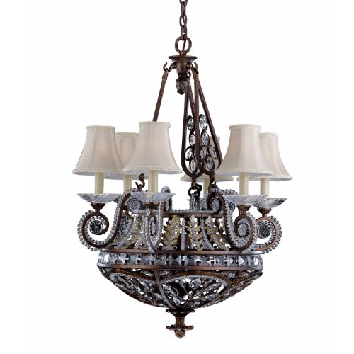 Finish:English Bronze w/ Gold & Silver Wash, Shade:Silk, Light Bulb:(9)60w B10 Cand F Incand 9-Light Chandelier. Six lights with soft back silk shades. Crystal accents. Three additional lights in large center bowl. Includes 6 feet of chain and 12 feet of cord