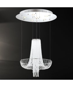 Light Bulb:(6)50w MR16 GU10 120v Halogen Gala 6-Light Chandelier Floating crystal, illuminated from above, each crystal faceted to catch and reflect the overhead light. A unique and inspiring addition to any project or setting. Chrome finish Clear crystal shade
