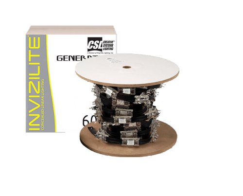 CSL Lighting INV60-3WT Invizilite Generation2 Pre-Assembled Kit features a 60-Feet roll of White super-flexible two-copper conductor cable with self healing PVC insulation rated at 90-Degree 12-Volt or 24V, 25 amp maximum 300W max. for 12V, or 600W max. for 24W. Cable is field cuttable anywhere along its length. 240 high grade clear polycarbonate construction stainless steel Sockets with aluminum heat shield are placed every 3-Inch, and will accept incandescent, xenon festoon lamps, or high-power one watt LED modules (sold separately). Socket and base snap together on the cable securing to the system without the use of a track. Socket can be easily removed by use of flat head screw driver and be re-installed if desired. INV60-3WT is 60-feet long by .61-Inch wide by .10-Inch thick, and includes pre-attached double-sided tape and mounting ear for secure installation. INV60-3WT comes one per package, includes three INVPW1 Power Feed 30 amp. terminal blocks, and three INVDE1 Dead Ends made of grade polycarbonate that snaps over end of cable with no tool. Low Voltage Transformer is required, and is sold separately. Invizilite Generation2 has been developed to answer all of the most challenging concealed lighting issues. Tight radii, sharp turns, confined coves and restrictive spaces are not a problem. A flexible two-conductor cable that allows maximum freedom for quick and easy installation and provides high load capacity for more light and fewer power feeds without requiring the use of a rigid track, making free-form designs a breeze. At CSL, we continue to lead the industry by offering amazing performance and design value in concealed linear lighting for Coves, Soffits and Under cabinet lighting. Our Invizilite, Mach 120, and Counter Attack series offers what may be the largest collection of halogen, xenon or fluorescent under-cabinet fixtures. Metal finishes including stainless steel, bronze and white are offered. Various cabling and switch options are available.