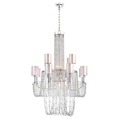 15Light CHANDELIER,CHROME-Flowing clear crystal beading, Silk crafted shades, Polished chrome frame.