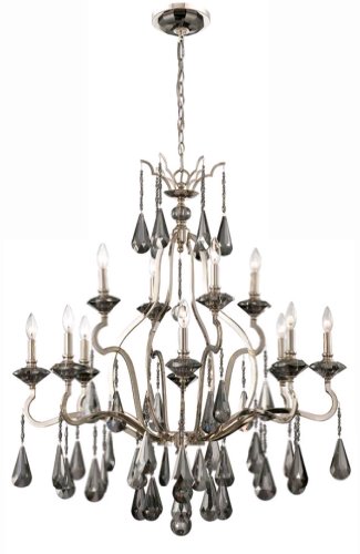 12Light CHAND, Polished NICKEL-Twice polished gun metal finish, Smoke crystal bobeches and accents.