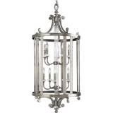 The elegance of traditional lighting shines in this beautiful pendant chandelier from the Progress Lighting collection. Inspired by Hollywood ballroom designs, the pendant combines clear crystal accents with a classic silver finish. The outer frame envelops twin candelabra frames stacked one on top of each other. It's an elegant and unique look for entry areas and foyers. With ten candelabra style lights.